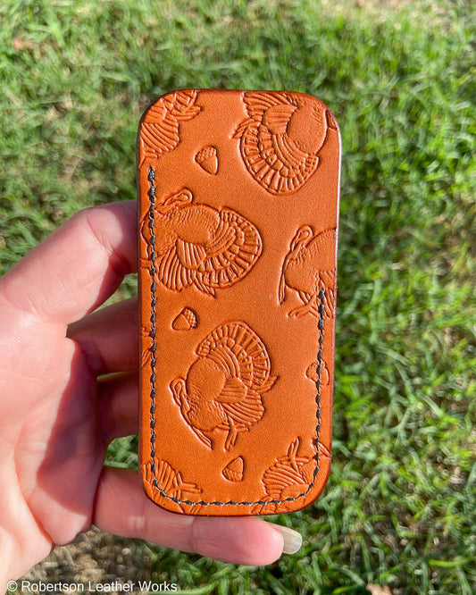 Small Tan Fall/Holiday Stamped Leather Knife Slip, Forest Stitching