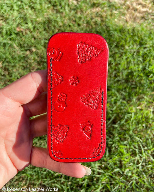Small Red Christmas Stamped Leather Knife Slip, Forest Stitching