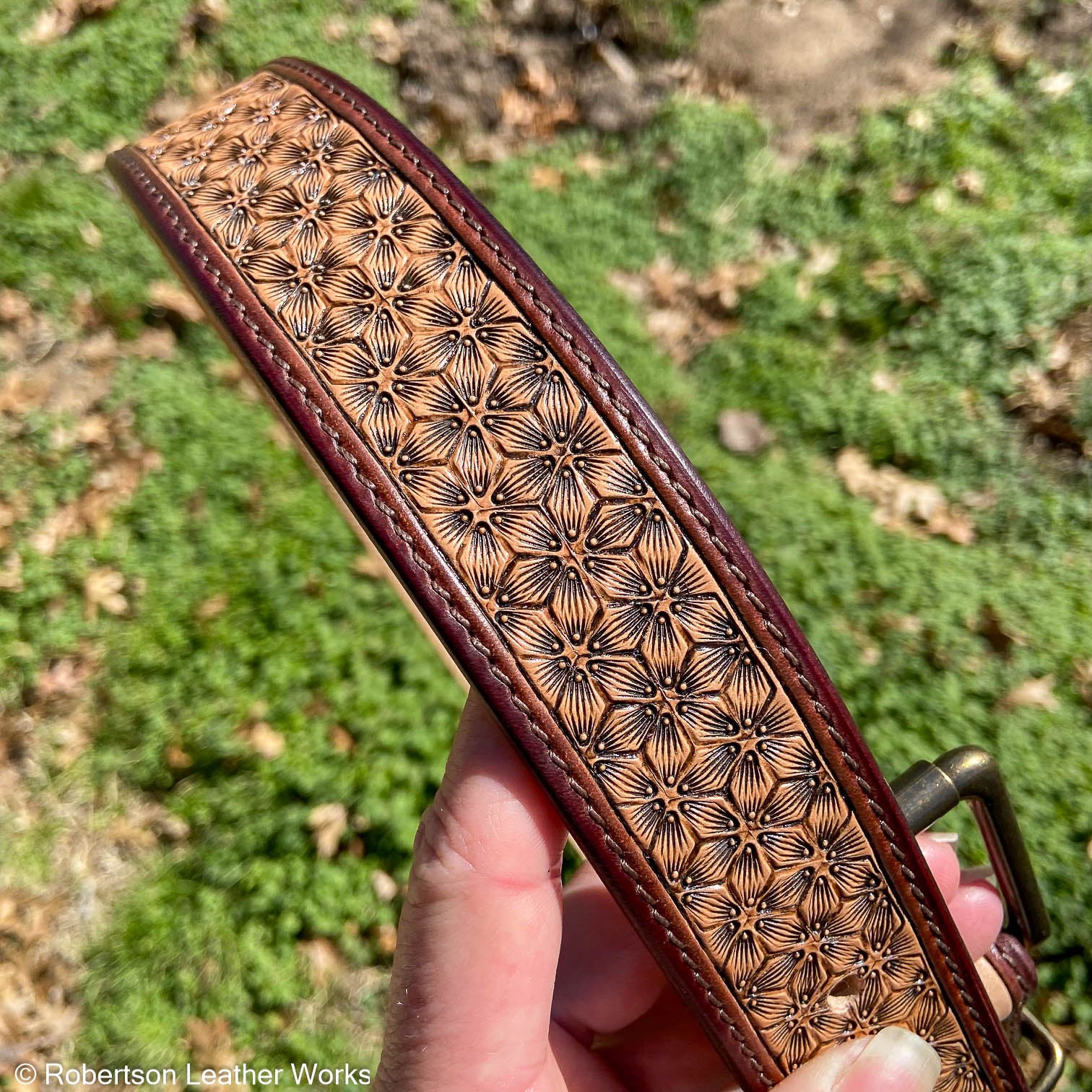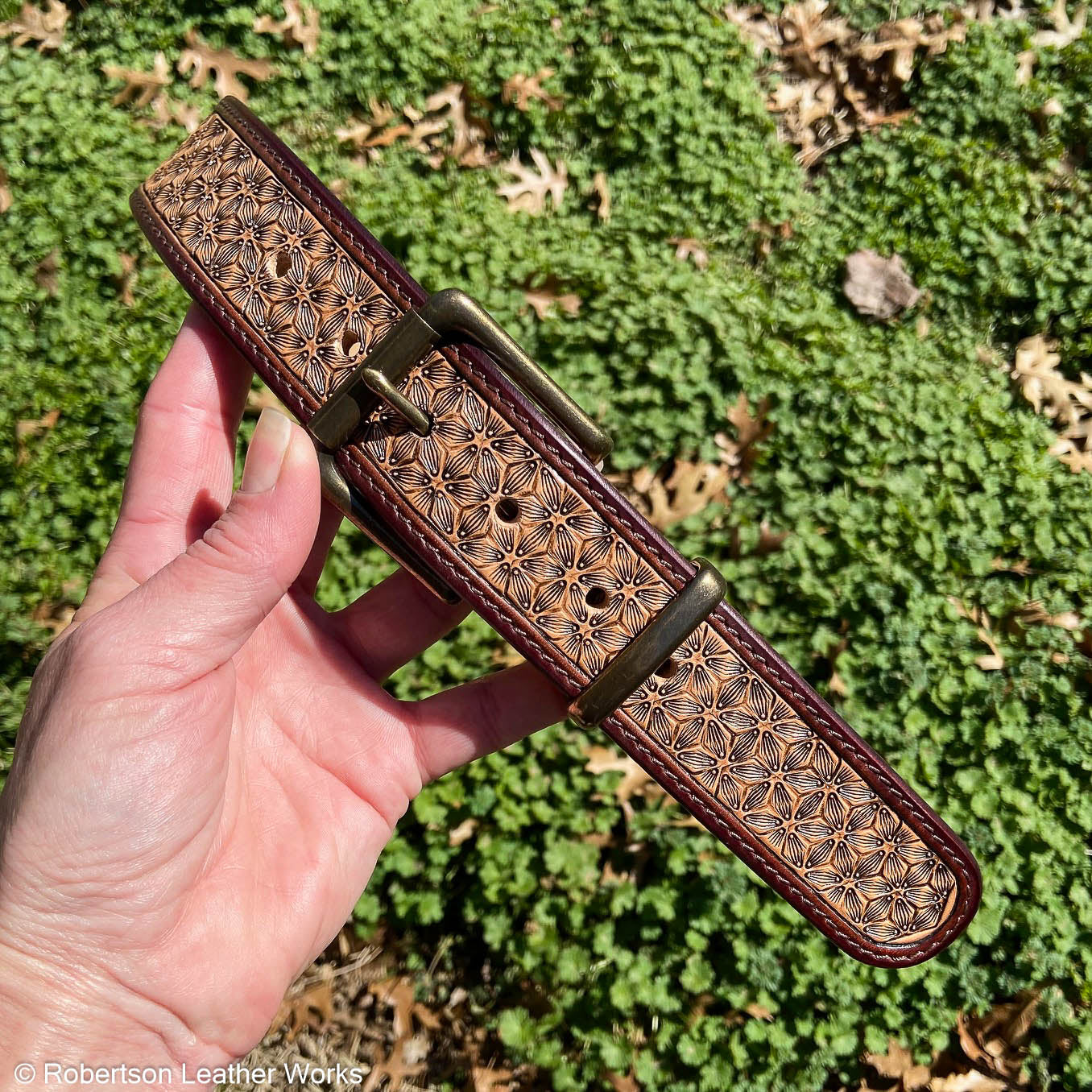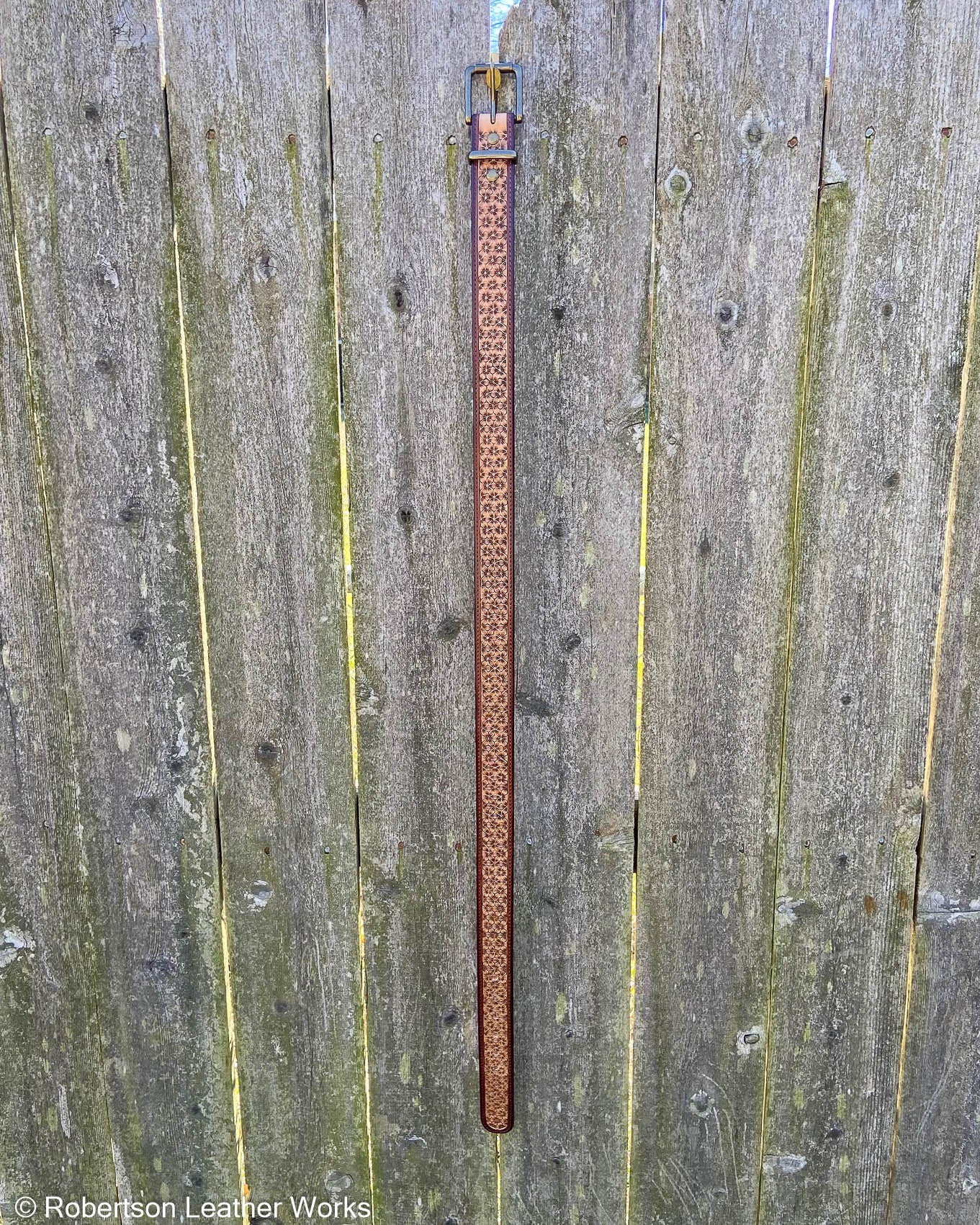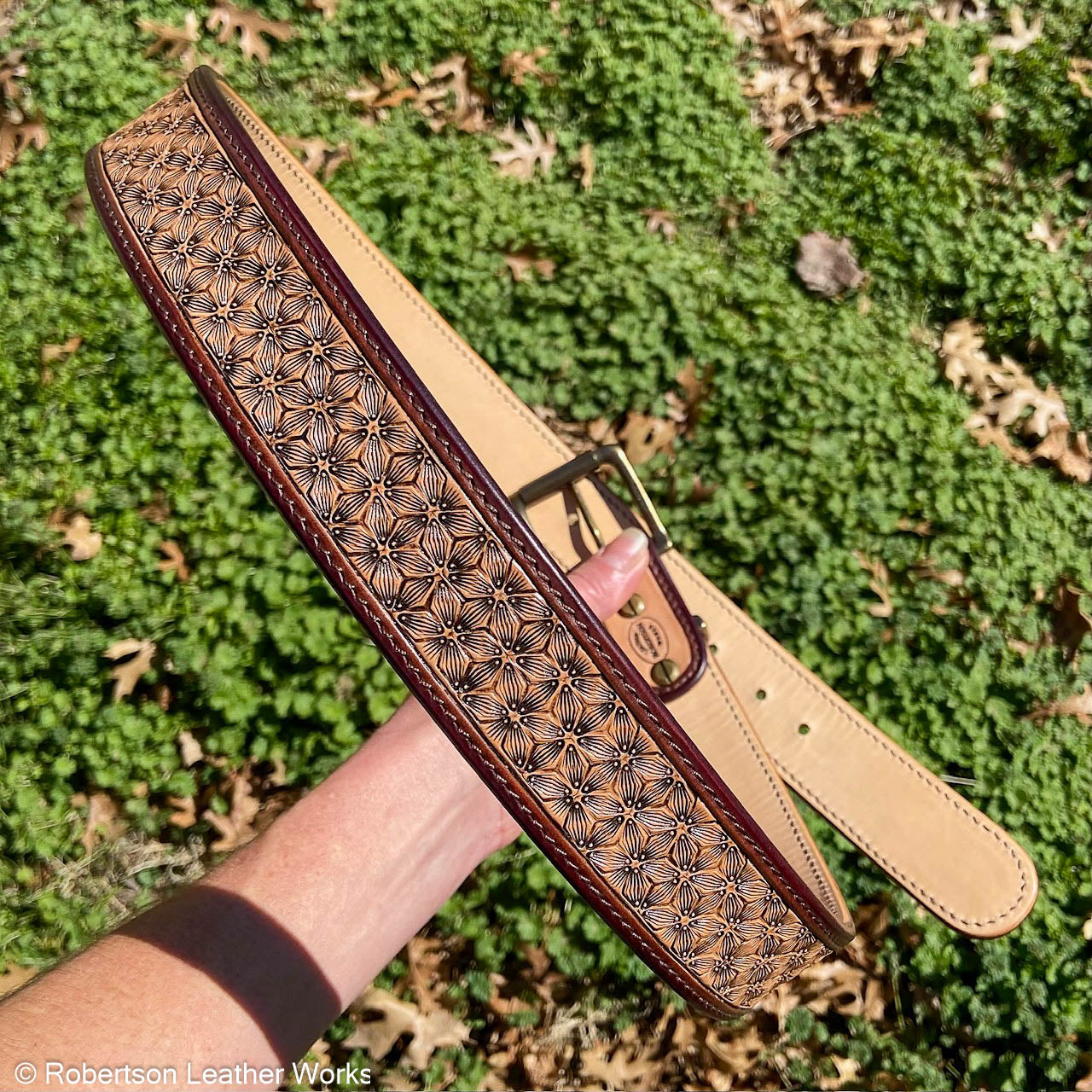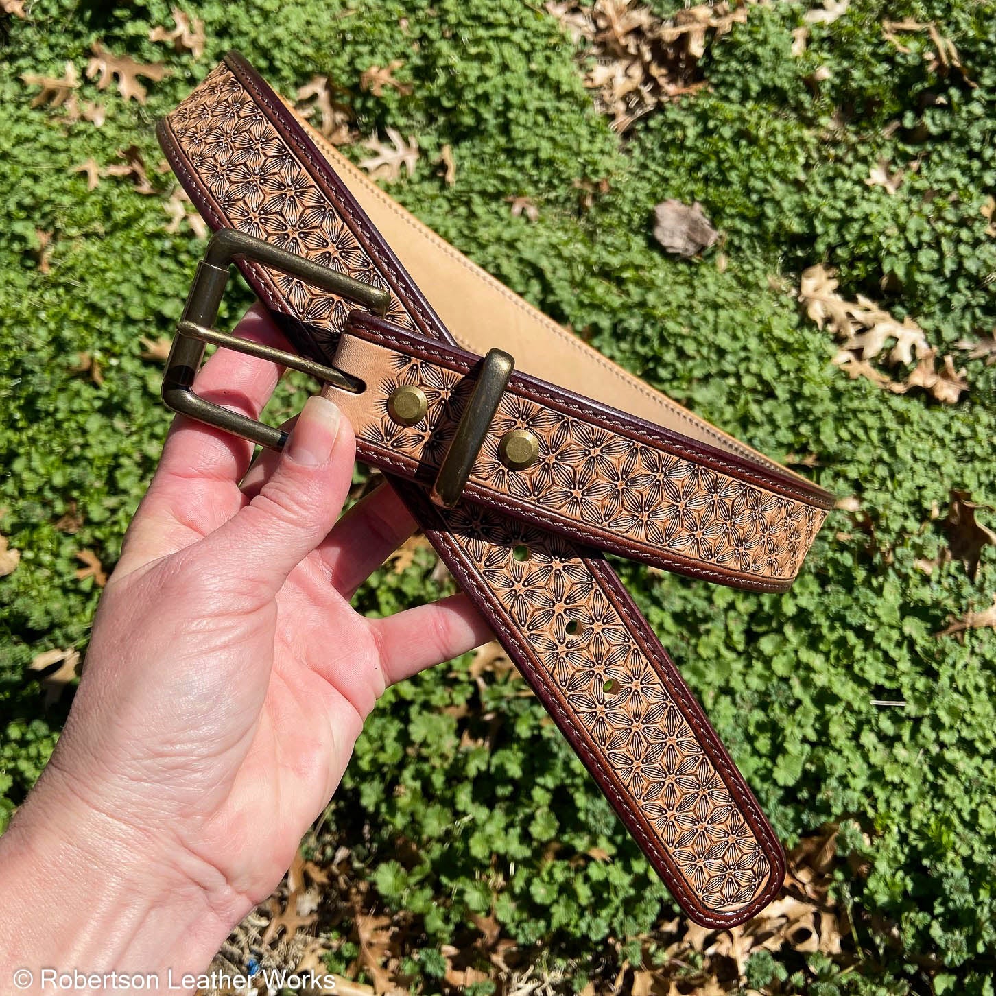 Floral Stamped Brown Border & Natural Veg Tan, lined with Natural Veg Tan. Brown Stitching.