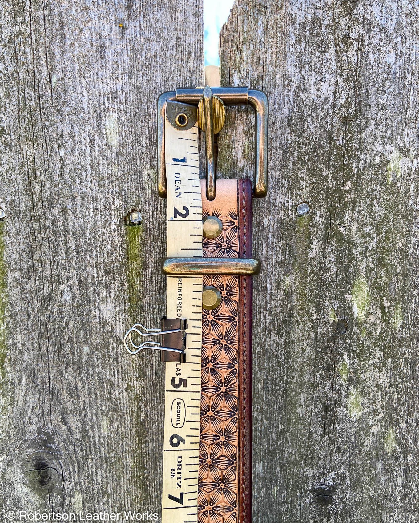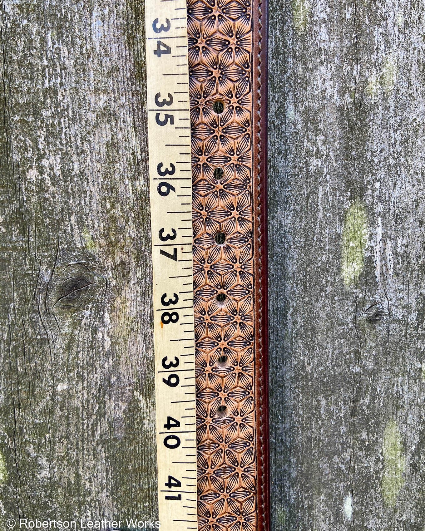Belt measures 1-1/2" wide x 37" from front of buckle to center hole