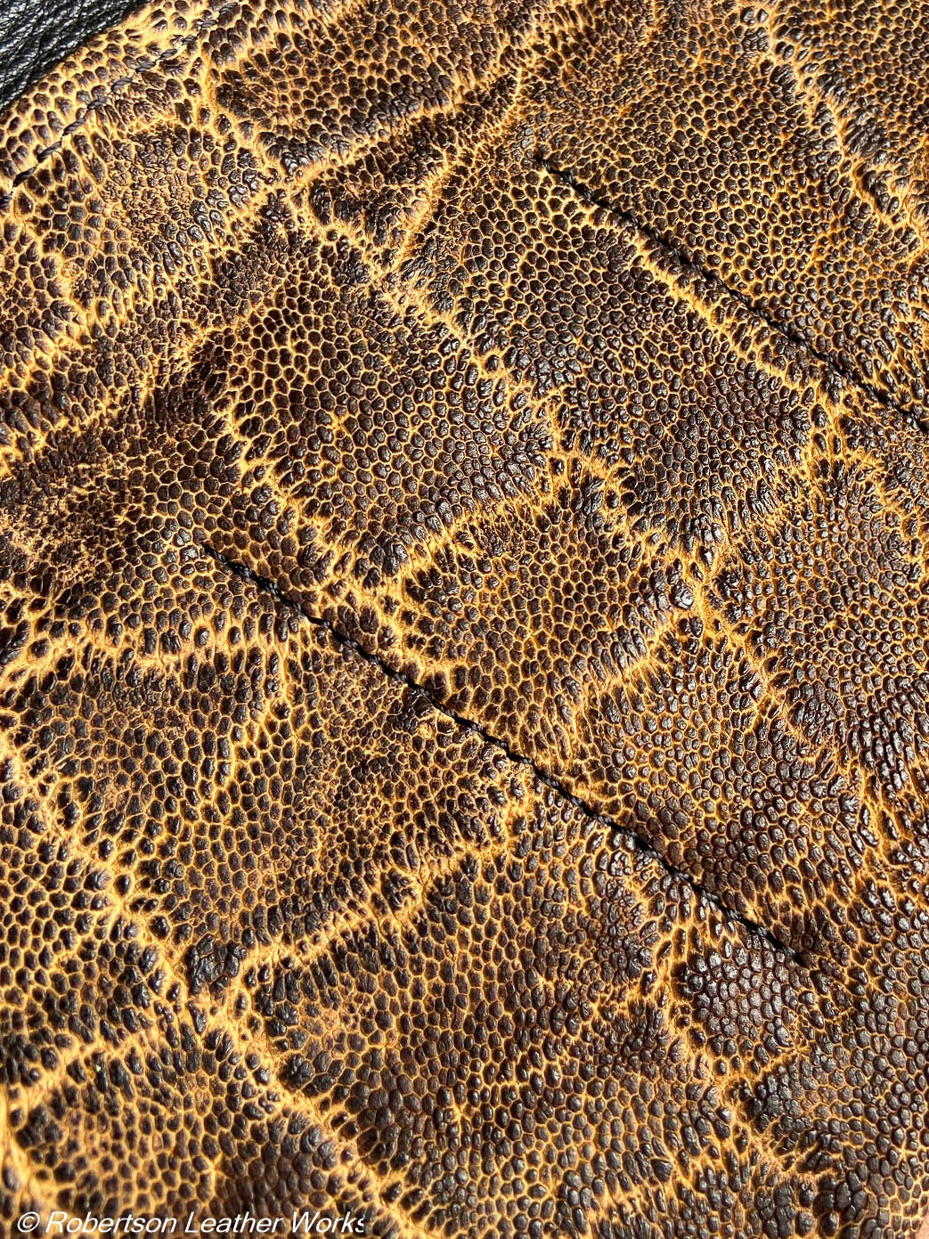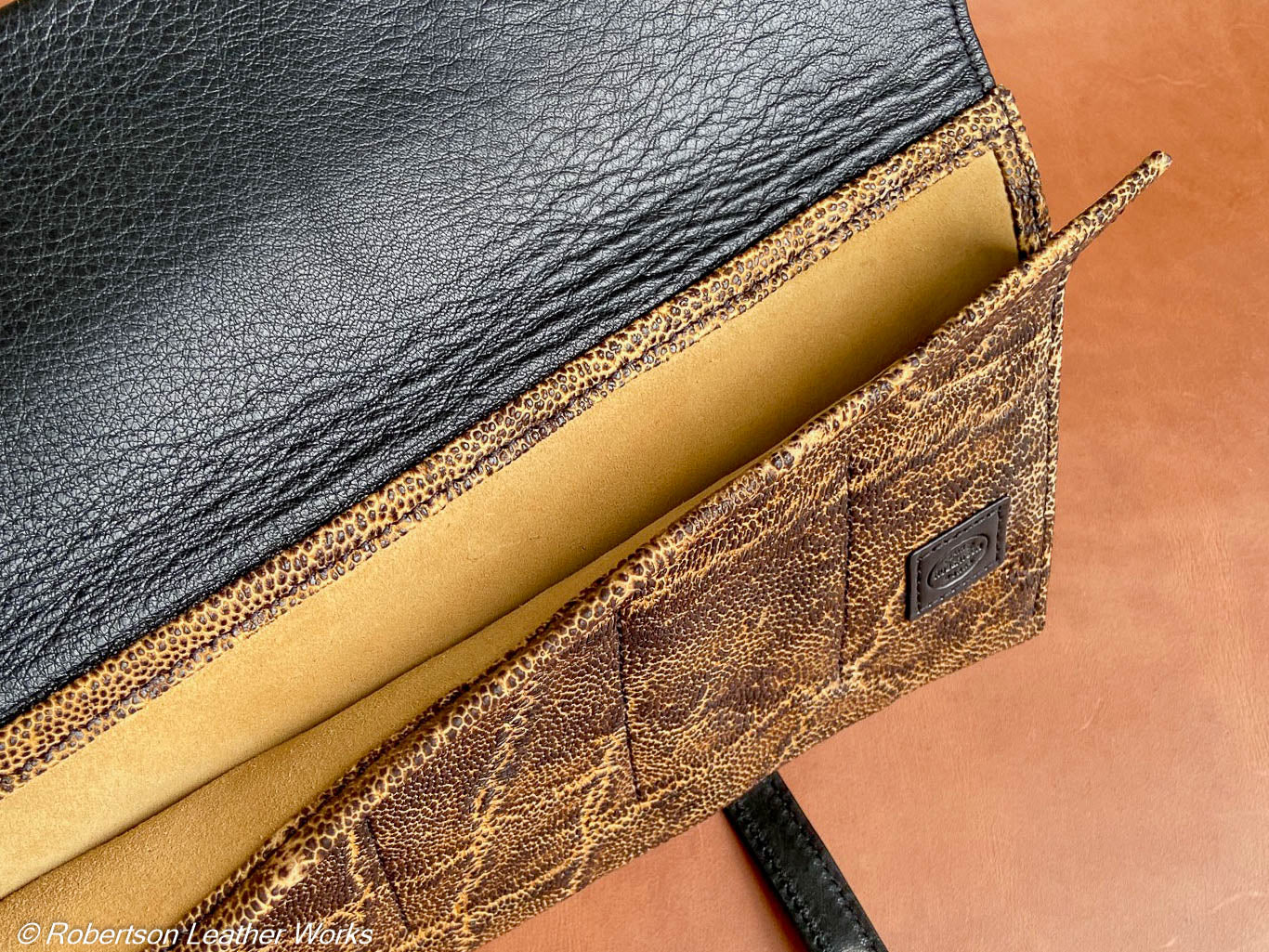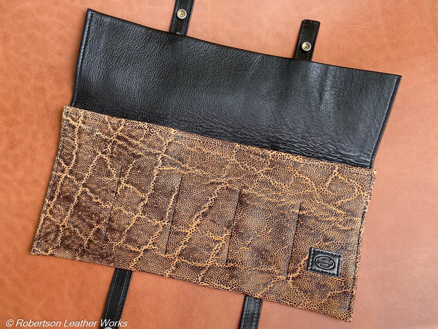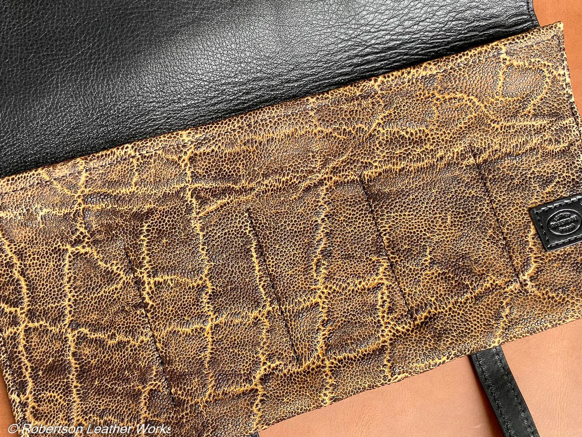 Hand-Dyed Elephant body and straps, Black Ikon leather Flap, heavy Sunshine Tan suede interior. This case has a Soft-Medium temper.