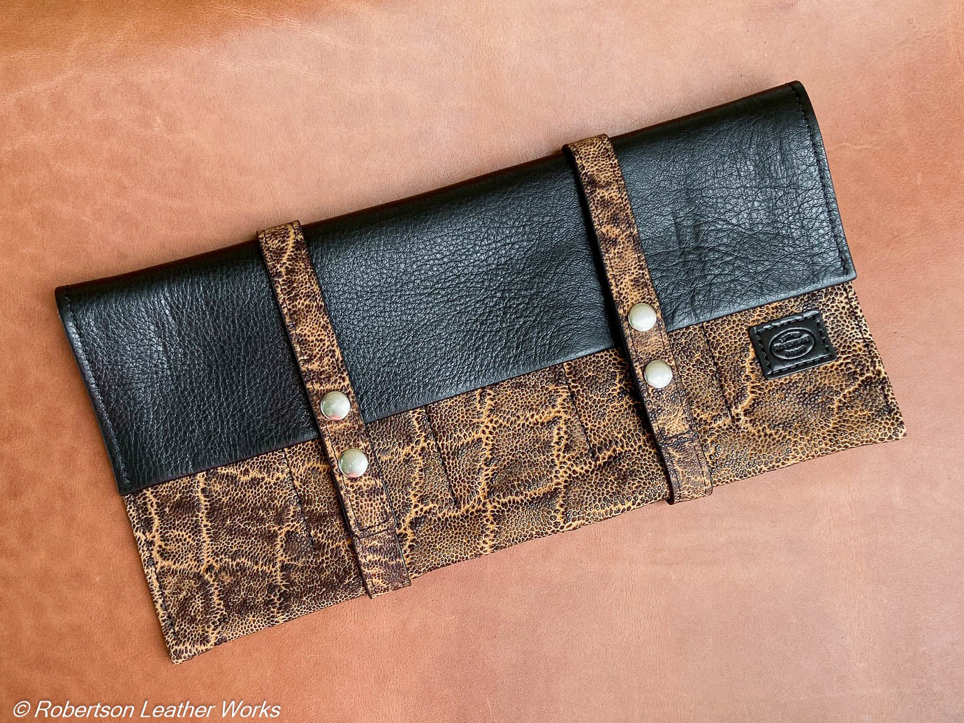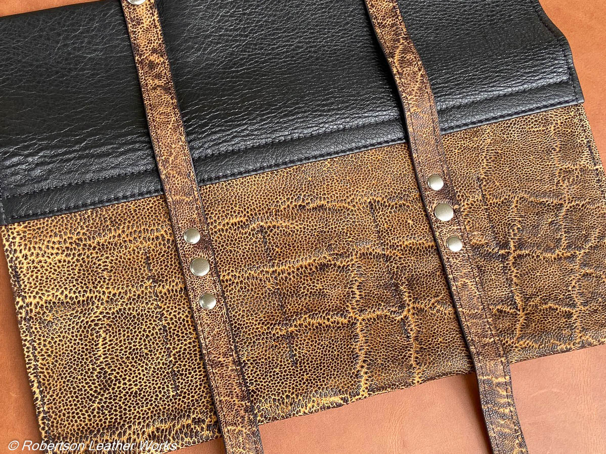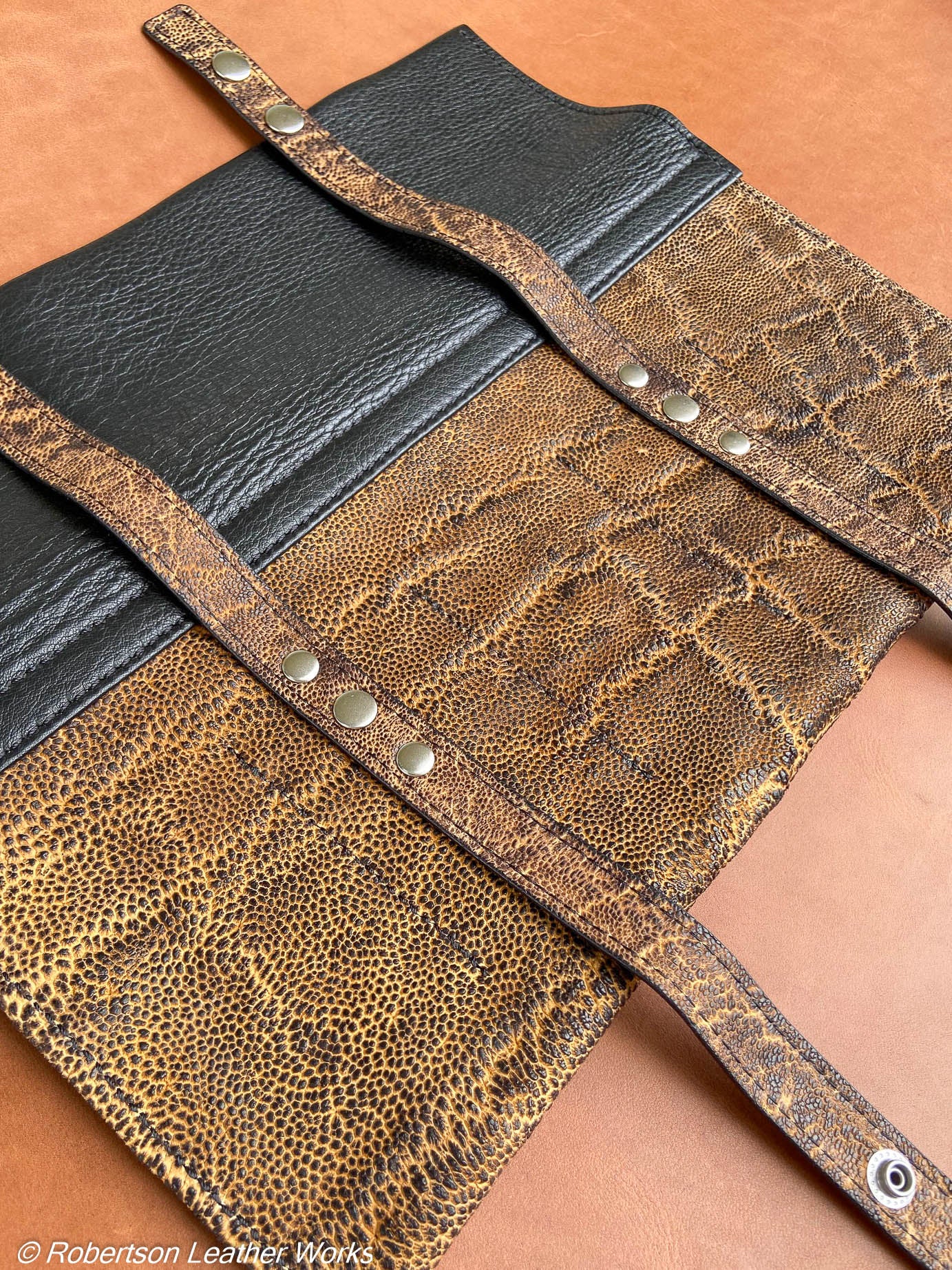 Hand-Dyed Elephant body and straps, Black Ikon leather Flap, heavy Sunshine Tan suede interior. This case has a Soft-Medium temper.