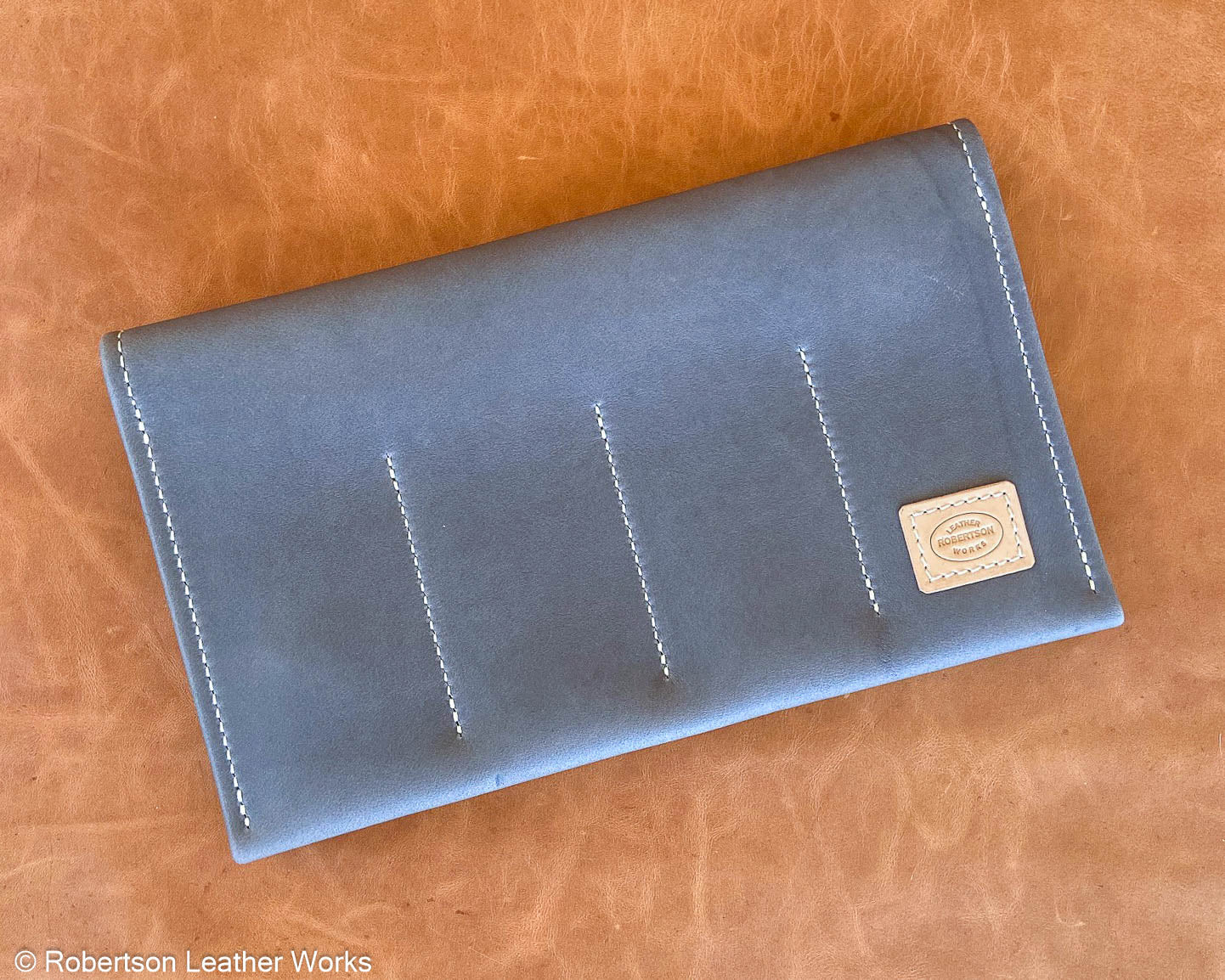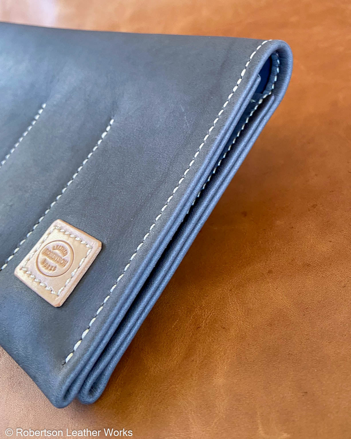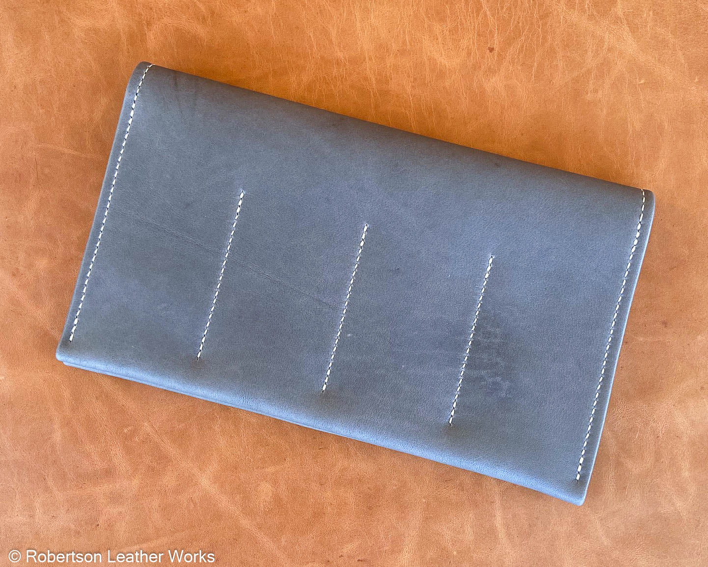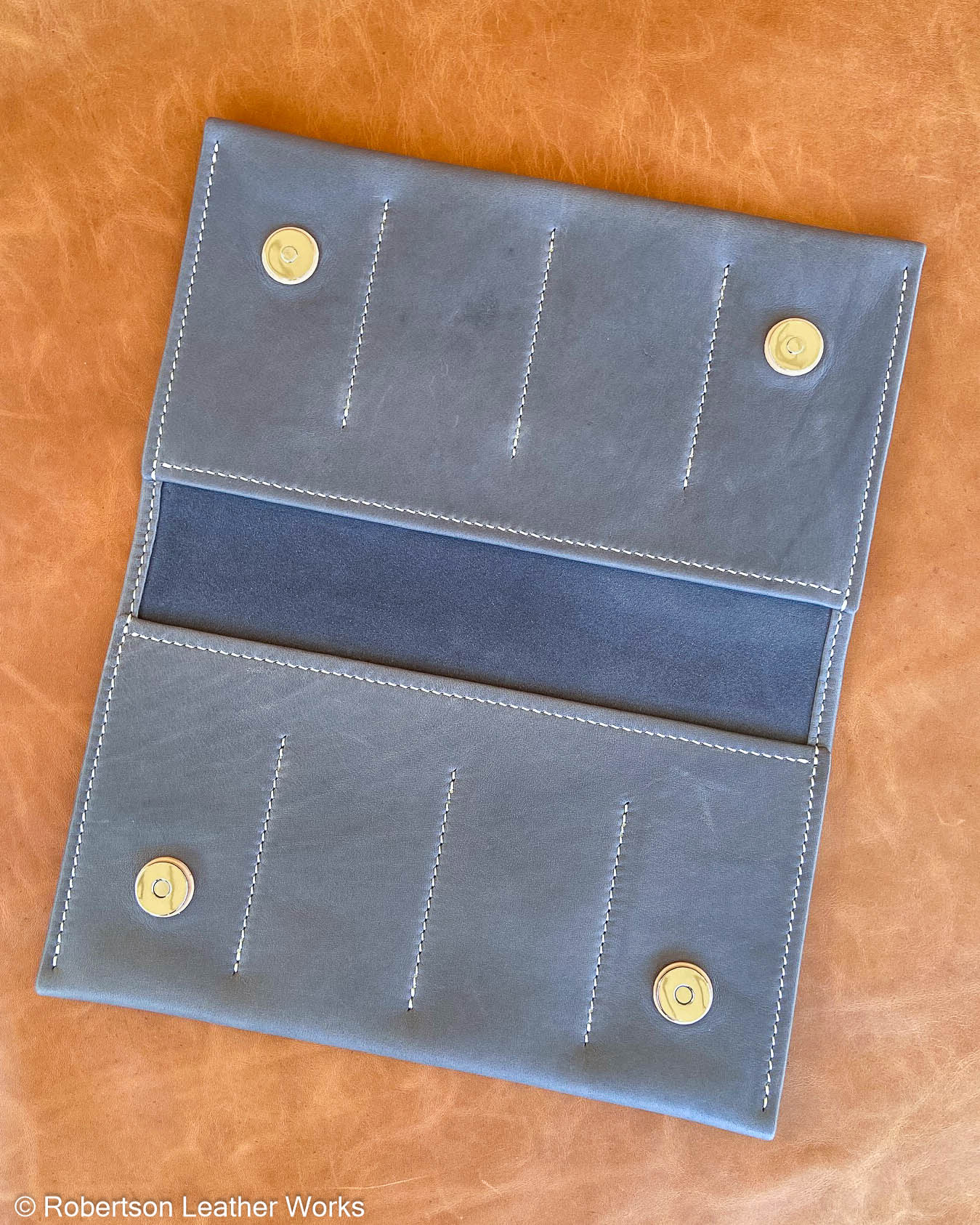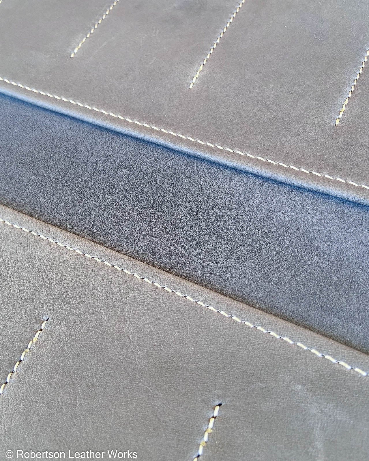 Buttery Soft Dove Gray leather exterior, heavy Charcoal Gray suede interior, cream stitching. This case has a Soft-medium temper.
