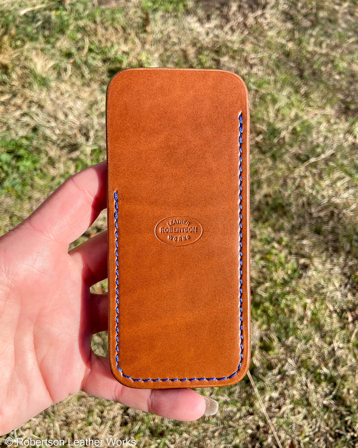 Large Antique Tan Oxford Leather Knife Slip, Blue Stitching