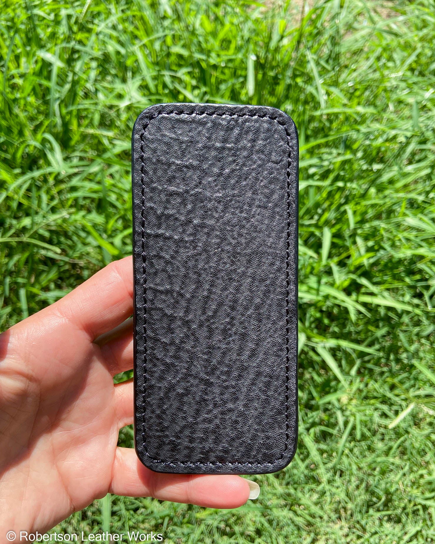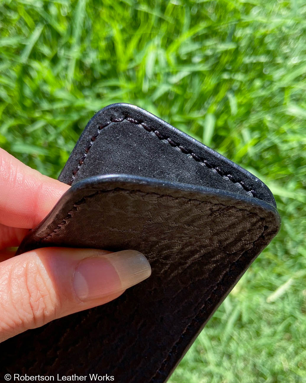 Black Shark leather front, Black Smooth Minerva leather back with a soft-medium temper and black stitching. Fully lined in black suede.