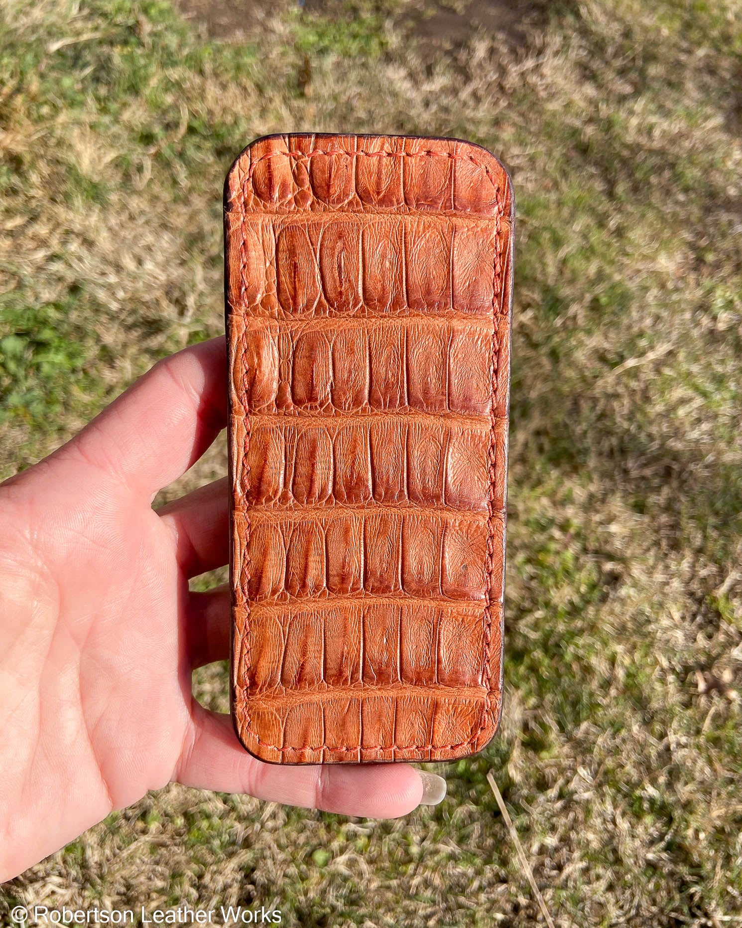 Large Cognac Caiman Leather Knife Slip, Rust Stitching