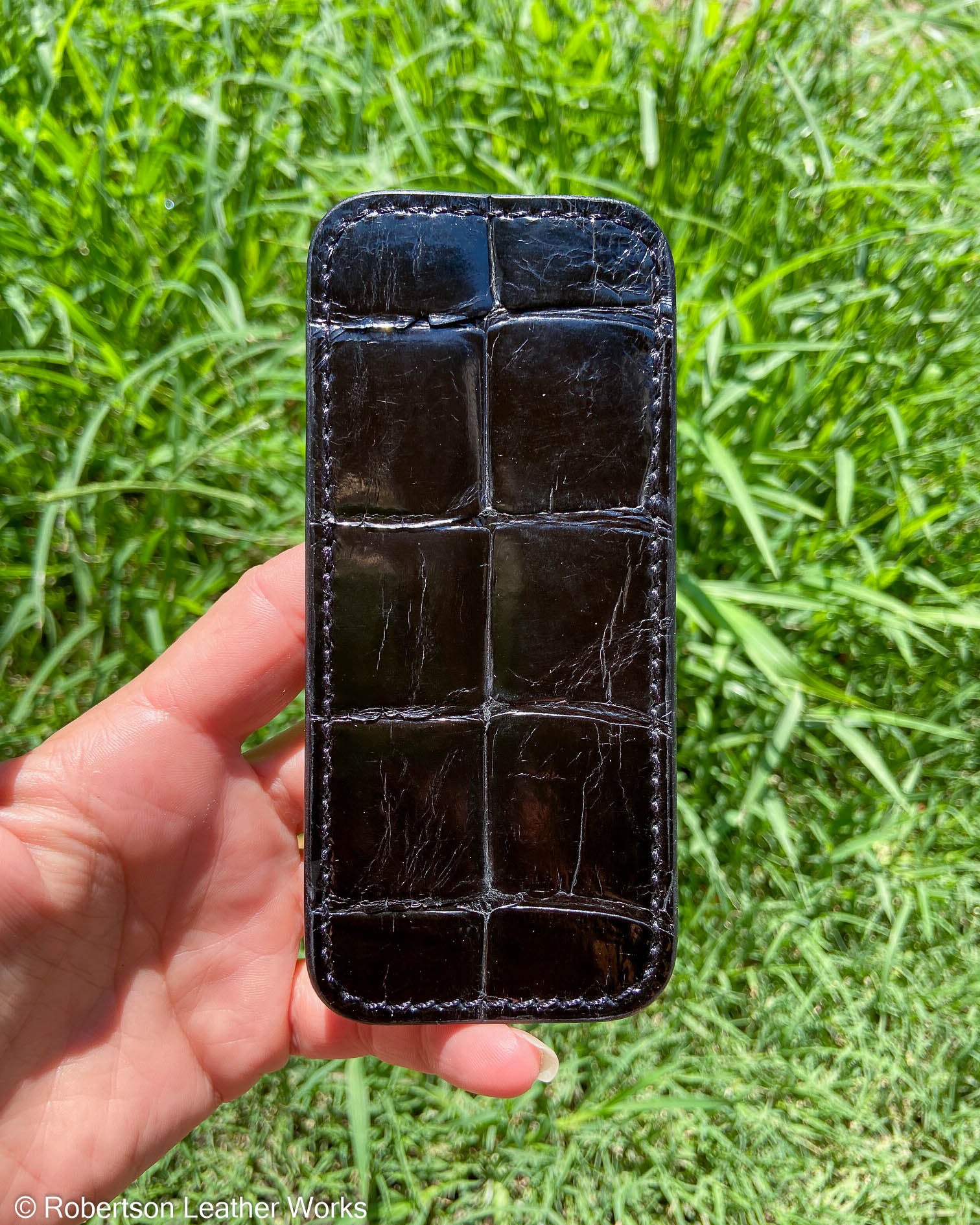 Large Black Glazed Alligator Leather Knife Slip, Black Stitching