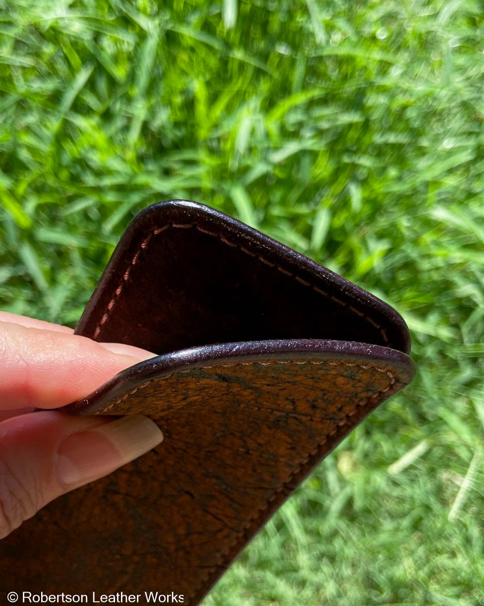 Each slip is cut and stitched by hand with edges burnished and sealed