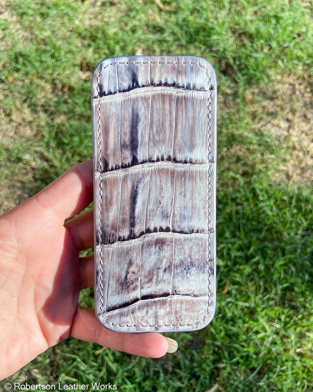 Hand Dyed Gray Caiman Tail leather front, Tobacco Smooth Minerva leather back with a medium temper and Silver stitching. Fully lined in Gray suede.