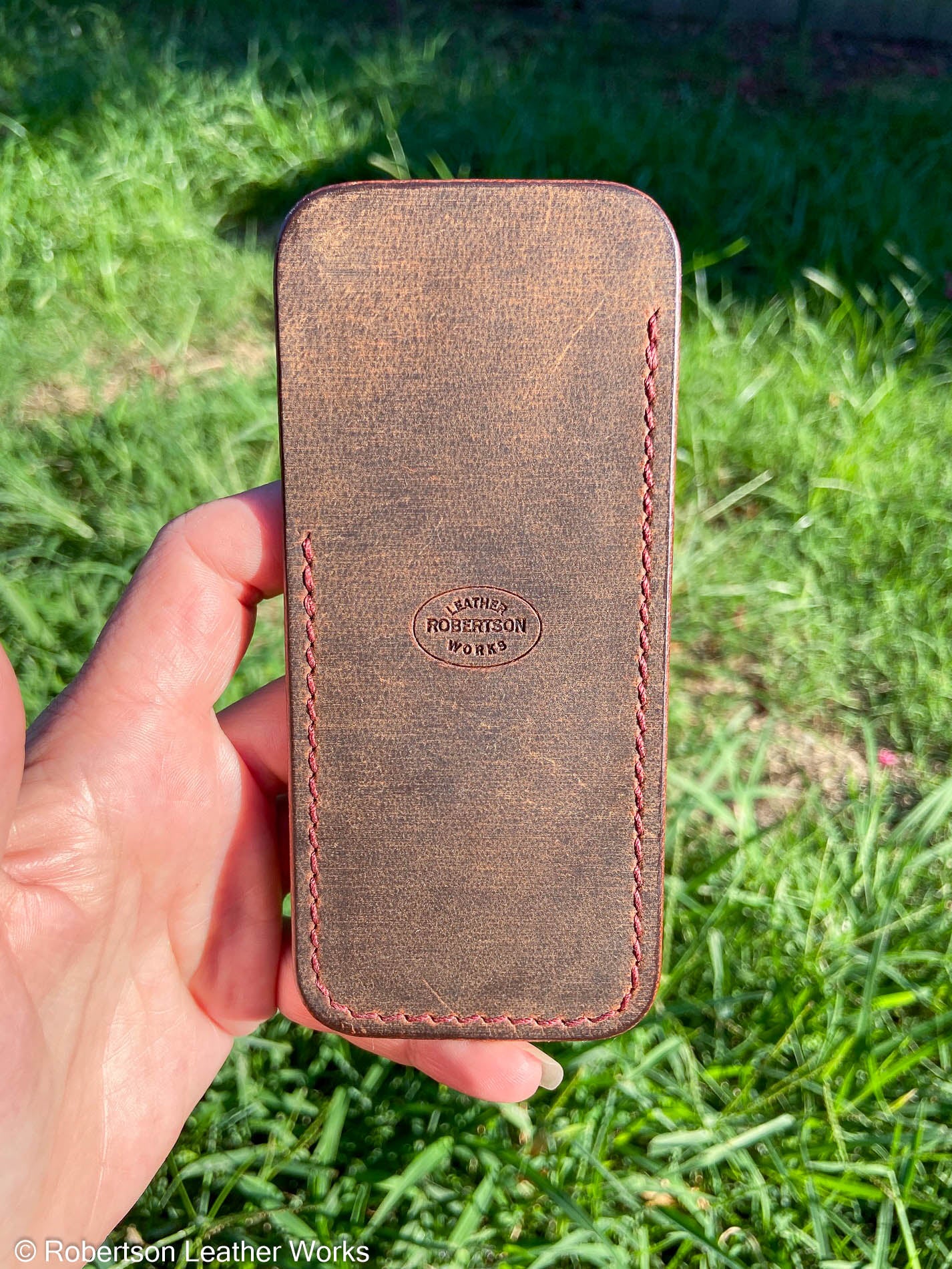 Large Rustic Brown Water Buffalo Leather Knife Slip, Maroon Stitching