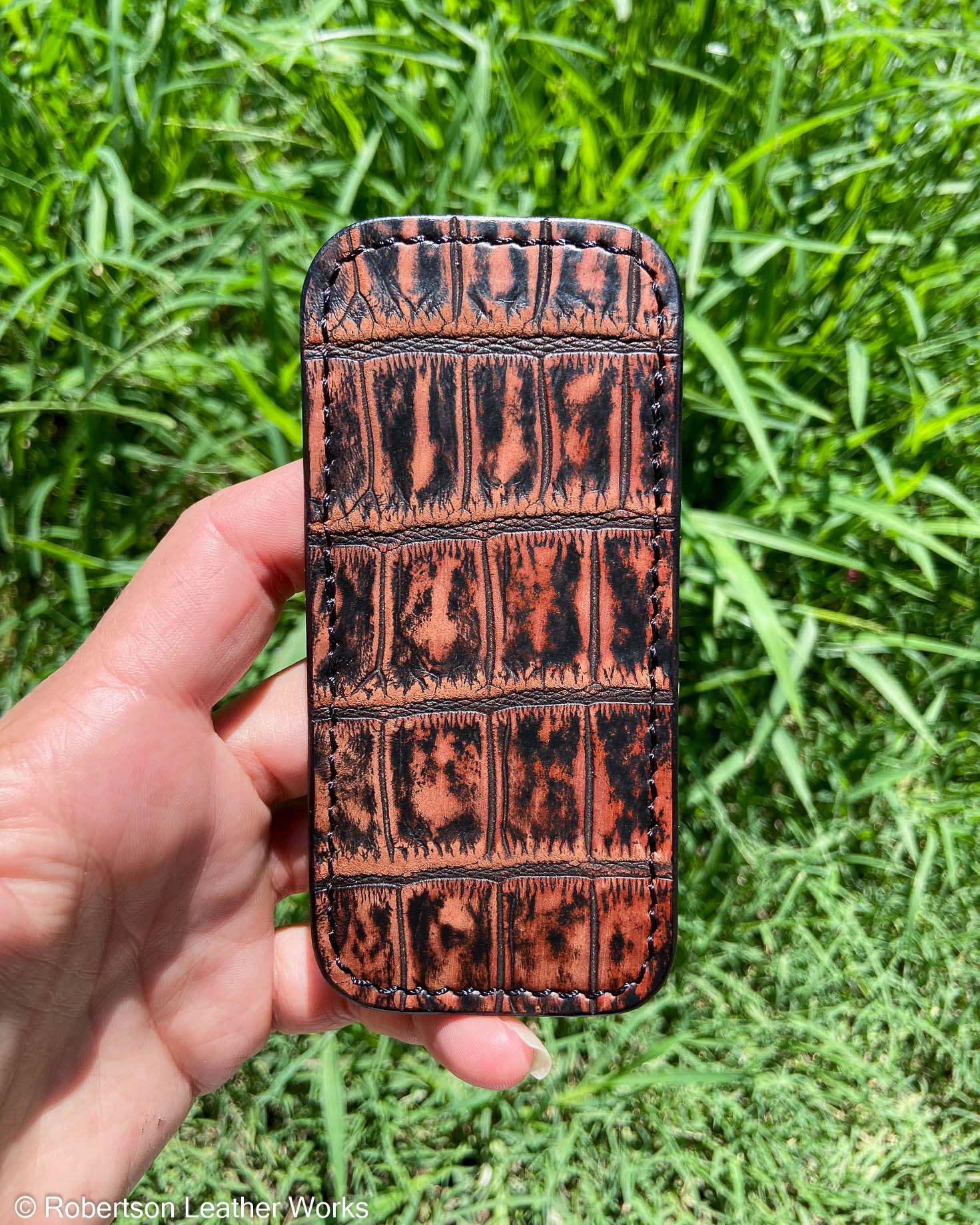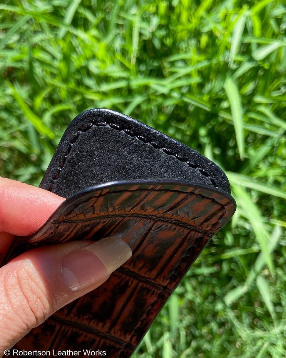 Medium Cognac Safari Alligator Leather Knife Slip, Black Stitching