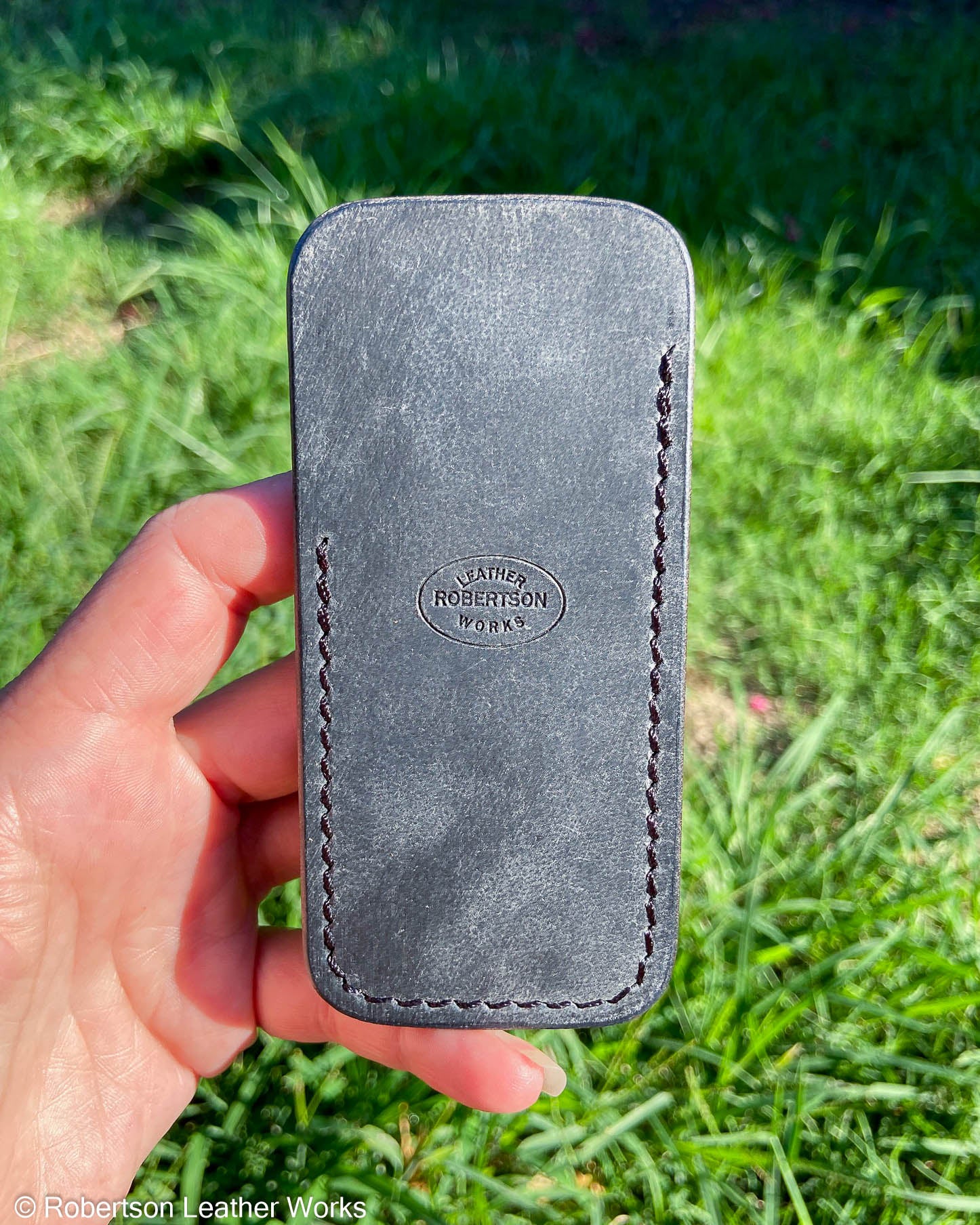 Medium Denim Water Buffalo Leather Knife Slip, Black Stitching