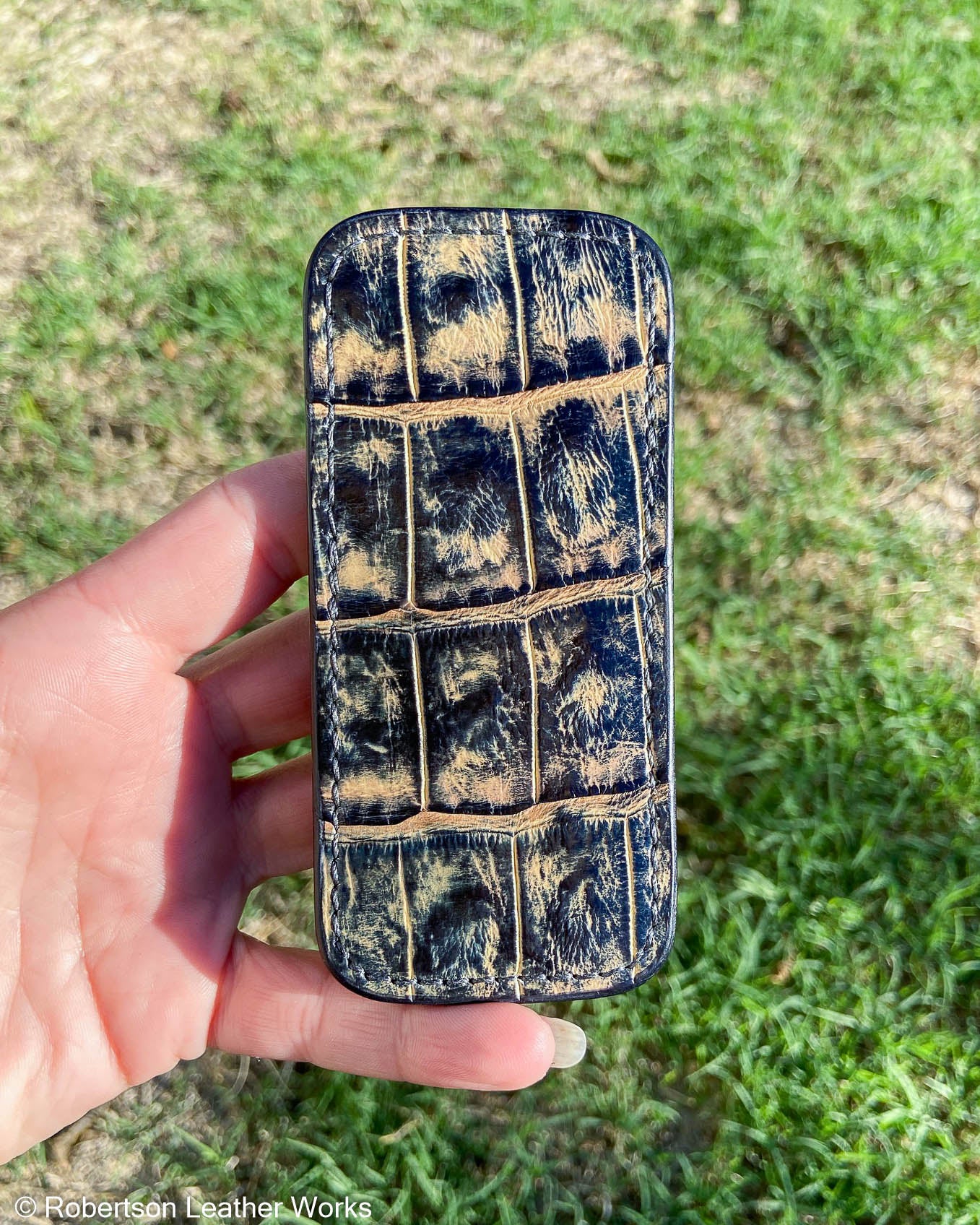 Medium H.D. Black-Tan Caiman Tail Leather Knife Slip, Charcoal Stitching