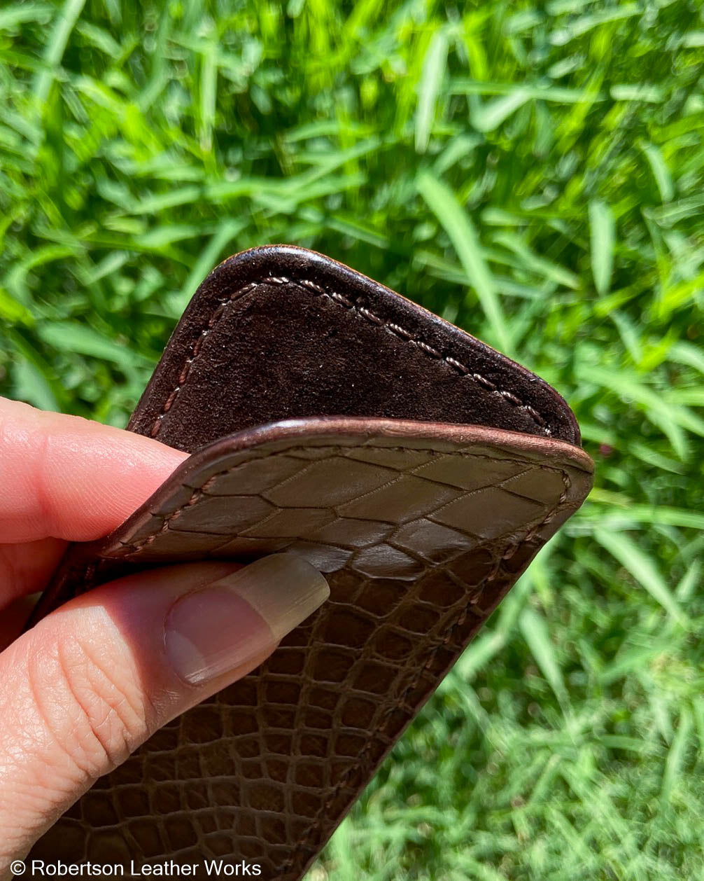 Taupe Alligator leather front, Brown Smooth Minerva leather back with soft temper and Brown stitching. Fully lined with Brown suede.