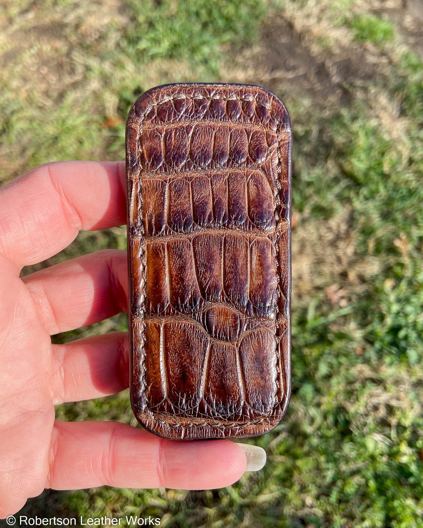 Micro Antique Brown Alligator Leather Knife Slip, Brown Stitching