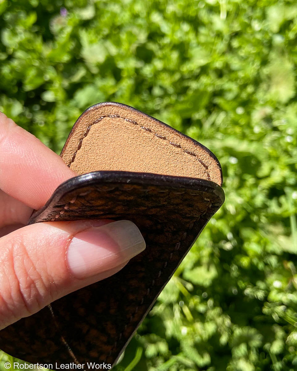 Each slip is cut and stitched by hand with edges burnished and sealed