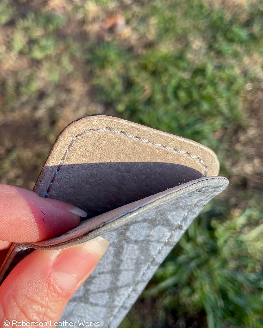 Each slip is cut and stitched by hand with edges burnished and sealed