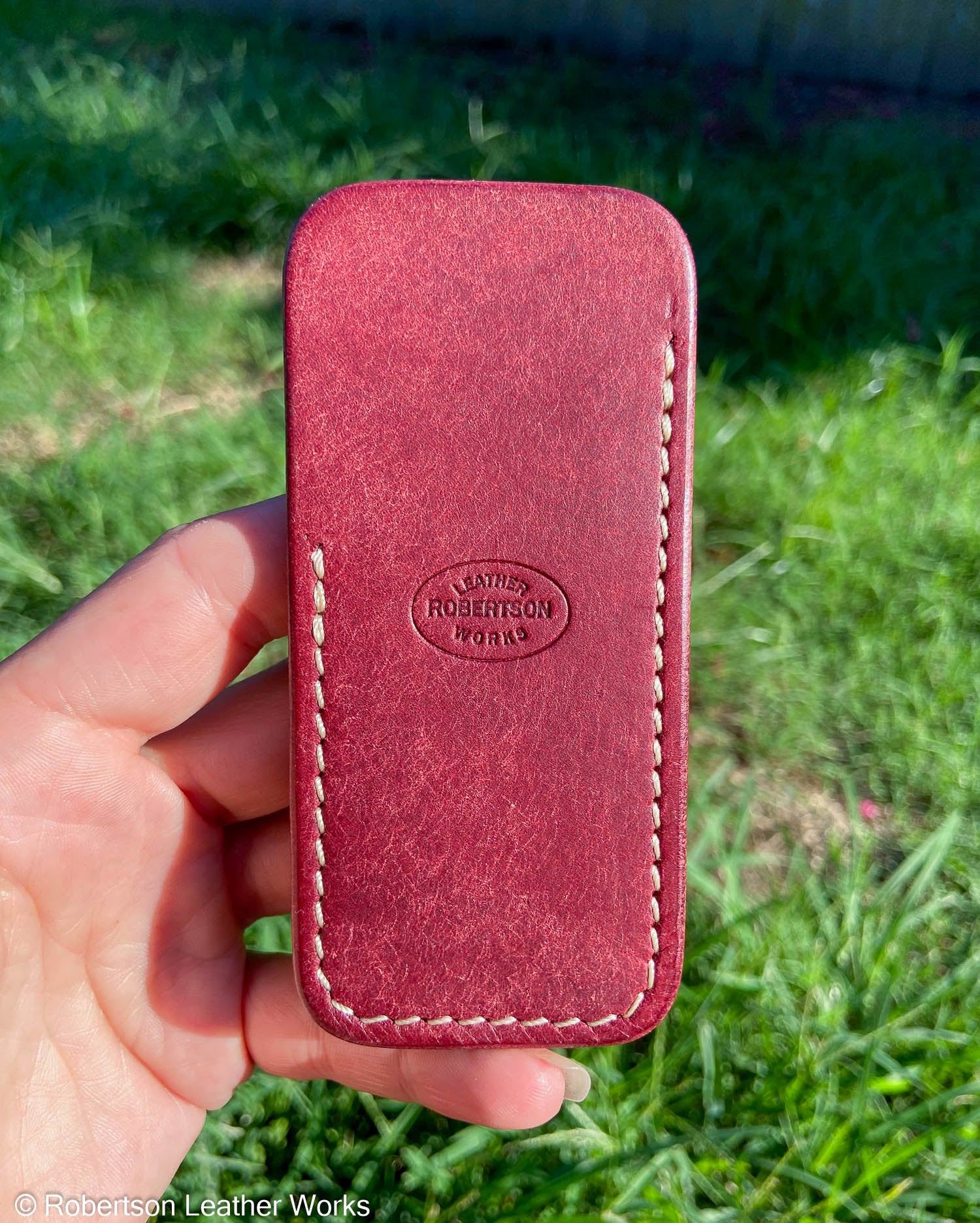Red Pueblo leather with soft temper and Cream stitching.