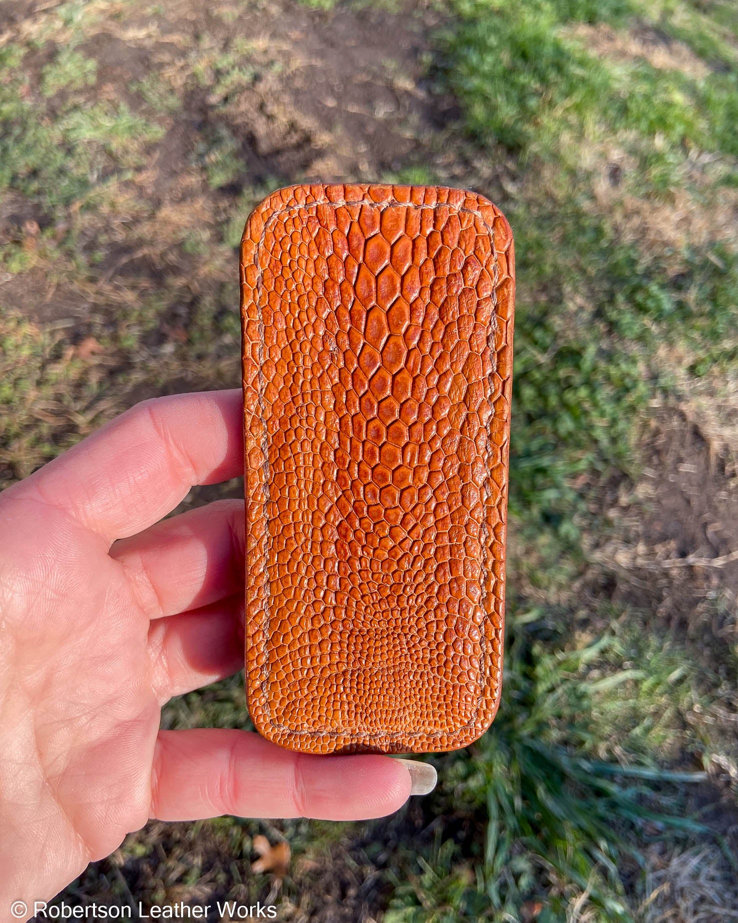 Schmedium Whiskey Emu Leg Leather Knife Slip, Light Brown Stitching