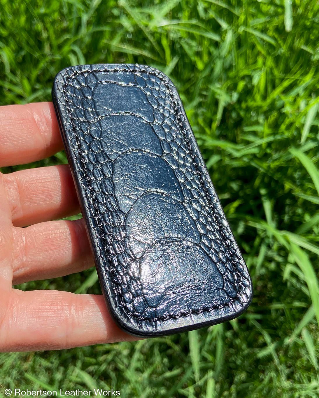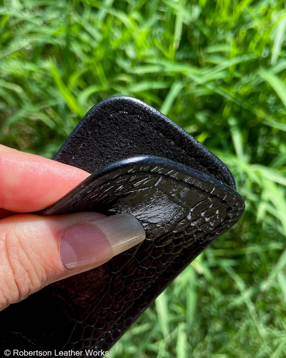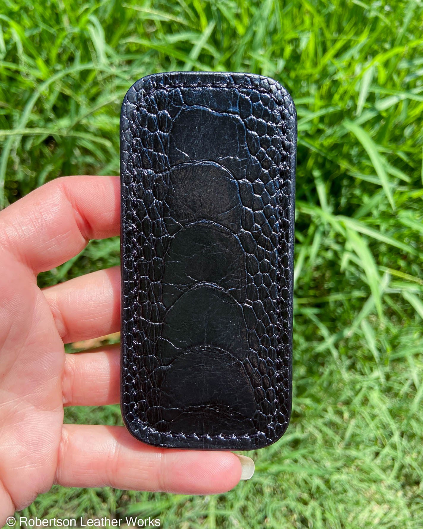 Small Black Glazed Ostrich Leg Leather Knife Slip, Black Stitching