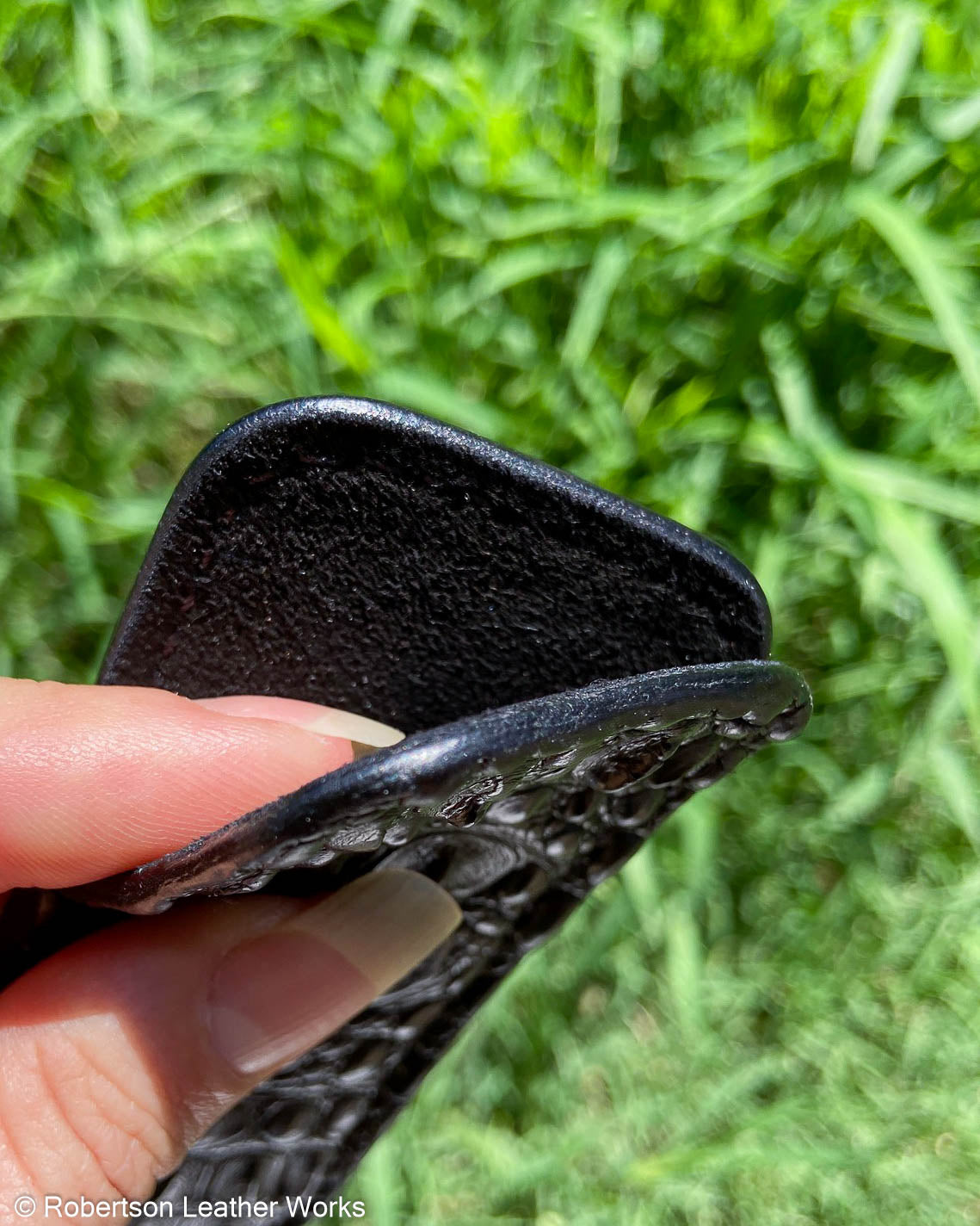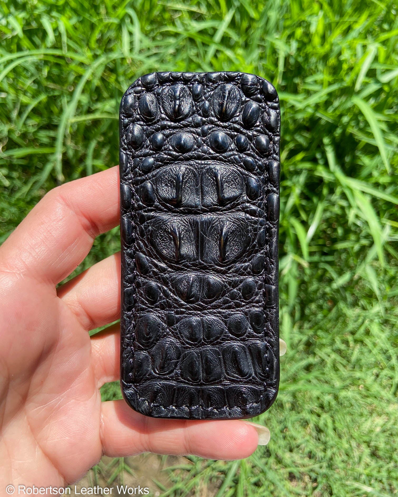 Small Black Hornback Caiman Leather Knife Slip, Black Stitching 1