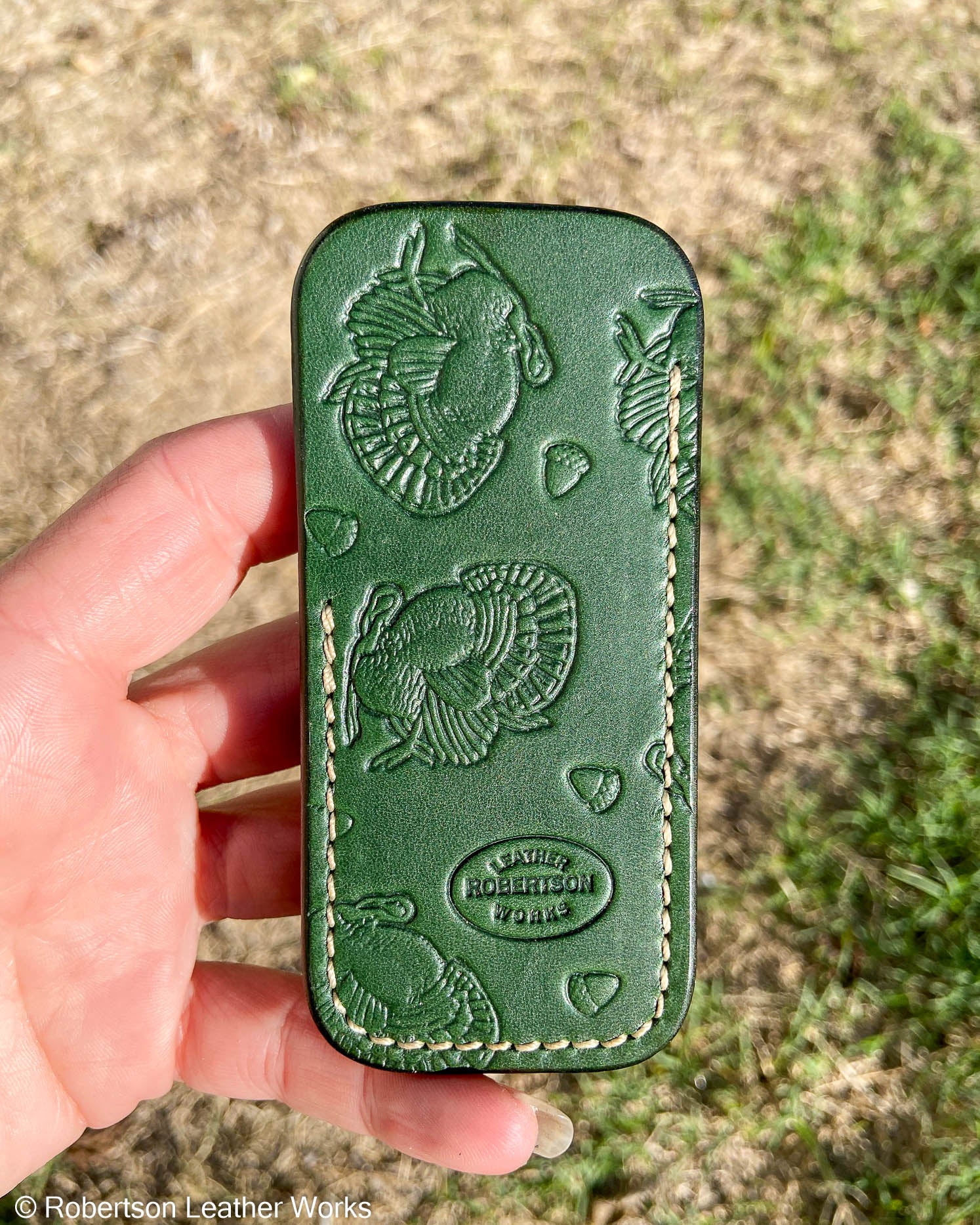 Small Green Fall/Holiday Stamped Leather Knife Slip, Cream Stitching
