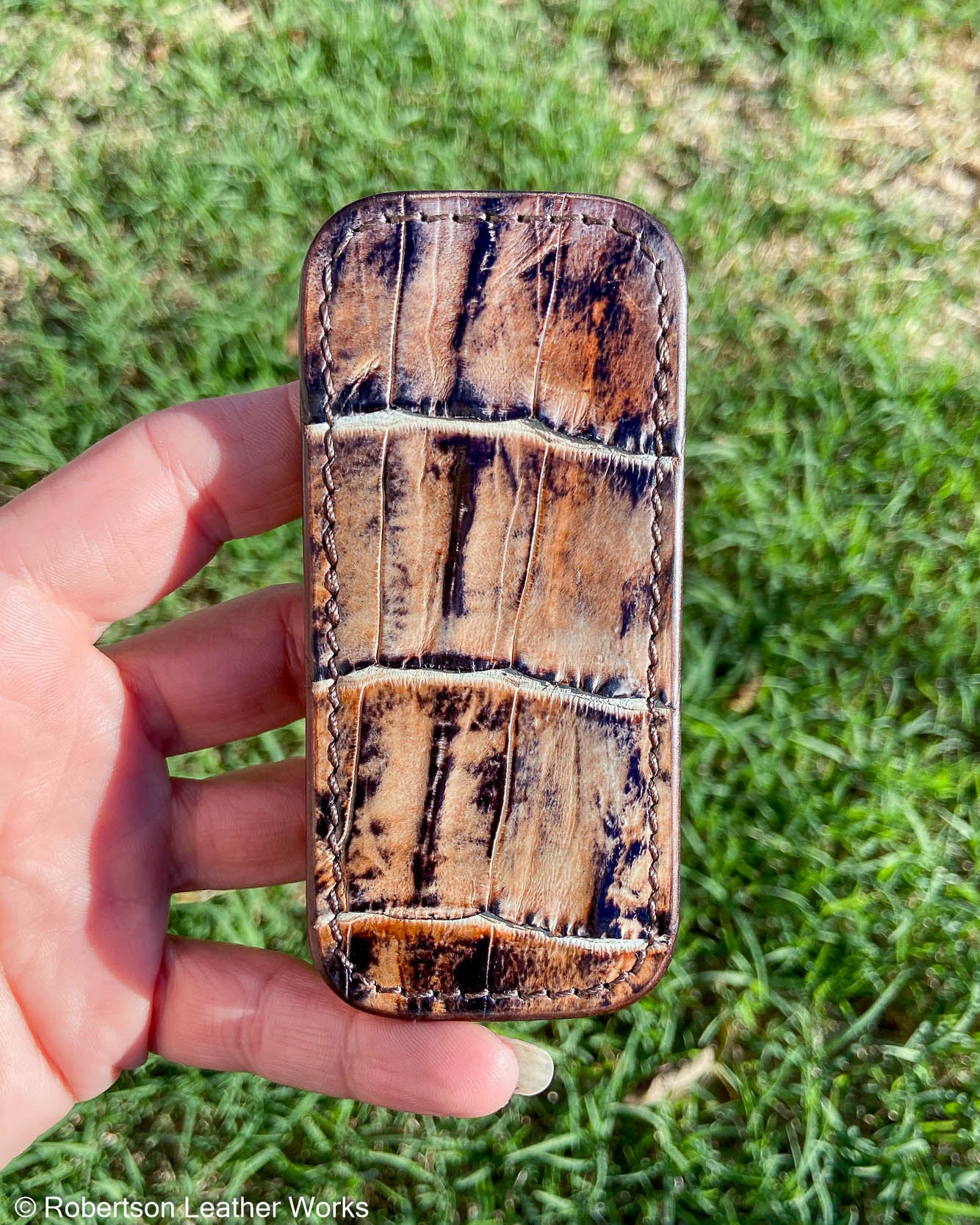 Small H.D. Brown-Greige Caiman Tail Leather Knife Slip, Brown Stitching