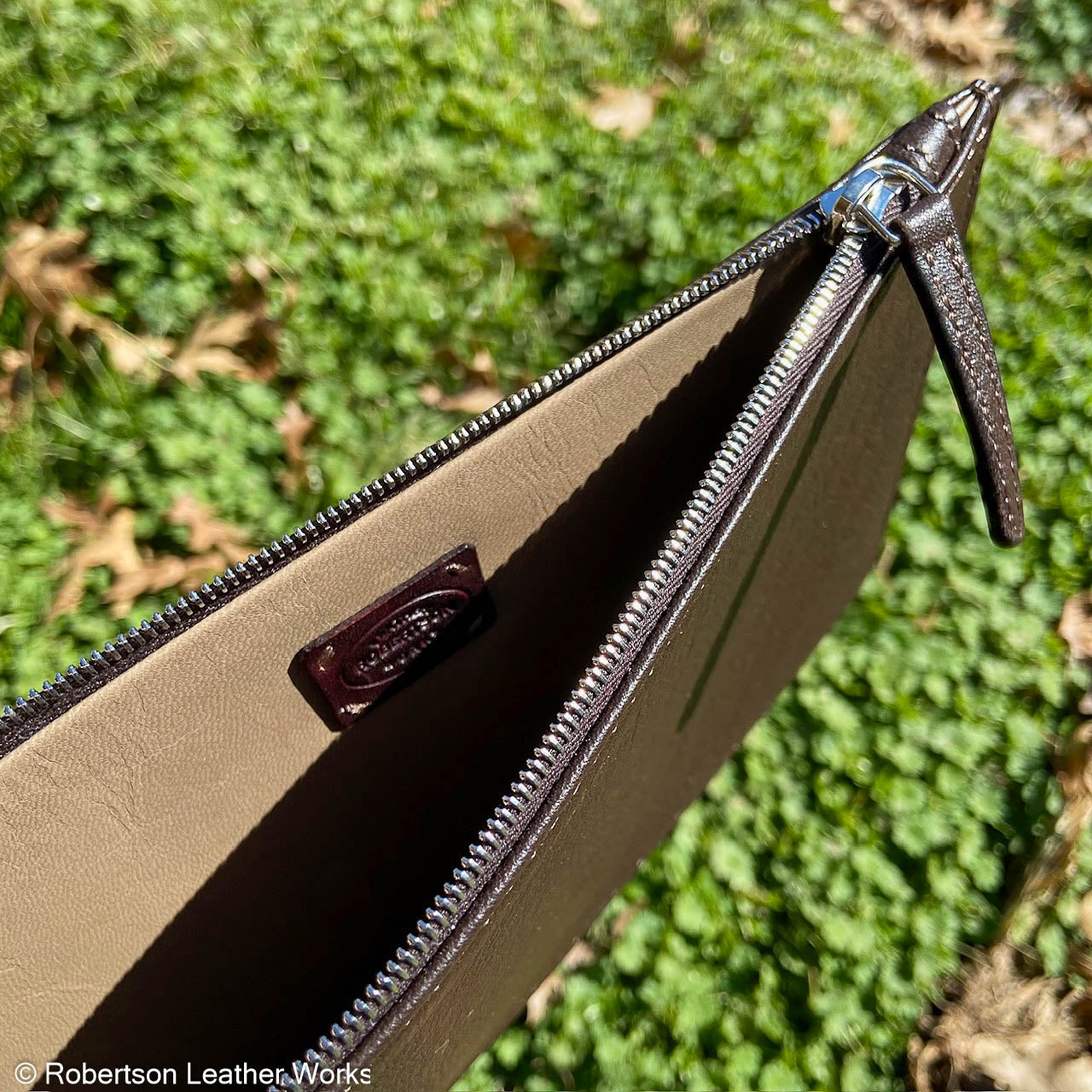 - Dark Brown Miracle Upholstery leather front and back, Taupe Kidskin liner